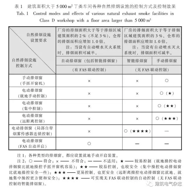 為方便理解和分析,下面以建筑面積大于5000m2丁類車間應(yīng)設(shè)排煙設(shè)施(以自然排煙設(shè)施)舉例,將設(shè)置自動排煙窗、智能排煙窗和手動排煙窗后的相關(guān)內(nèi)容,列表進(jìn)行說明,如表1所示。
