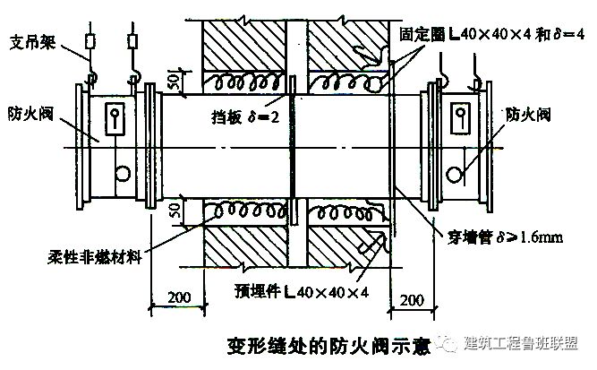 ③:風(fēng)管穿越結(jié)構(gòu)變形縫處應(yīng)設(shè)置三防帆布柔性短管(消防風(fēng)管采用防火帆布),其長(zhǎng)度每邊長(zhǎng)出變形縫寬度100mm。負(fù)壓風(fēng)管要采用金屬軟接。